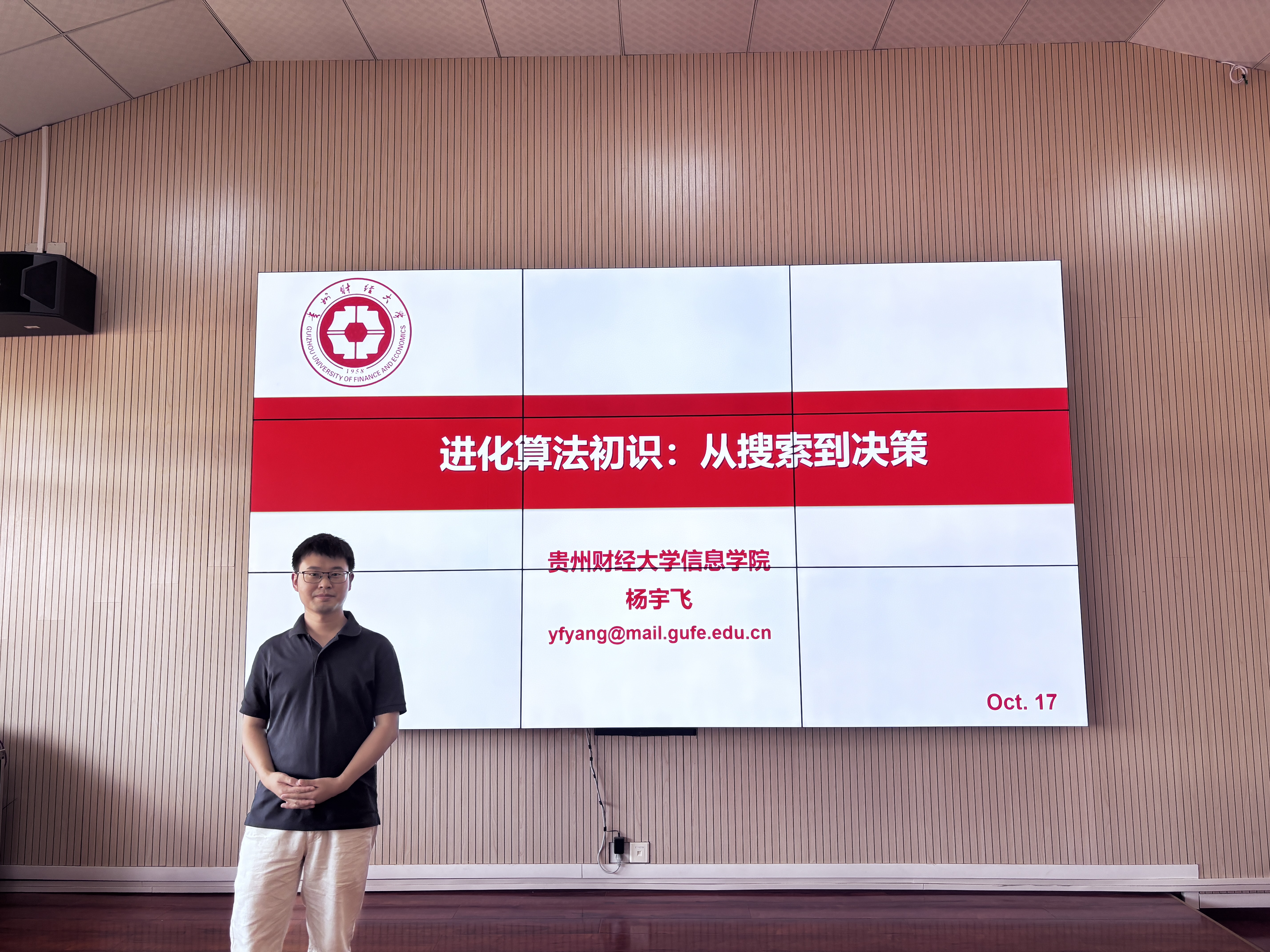 杨宇飞博士以“进化算法:从搜索到决策”为主题,系统介绍了进化计算的基本原理、典型算法与多目标优化方法,其进化算法的核心思想是通过“选择、交叉与变异”等操作,在复杂搜索空间中寻找最优解。本讲座还结合实例分析进化算法在工程与智能系统中的应用潜力。