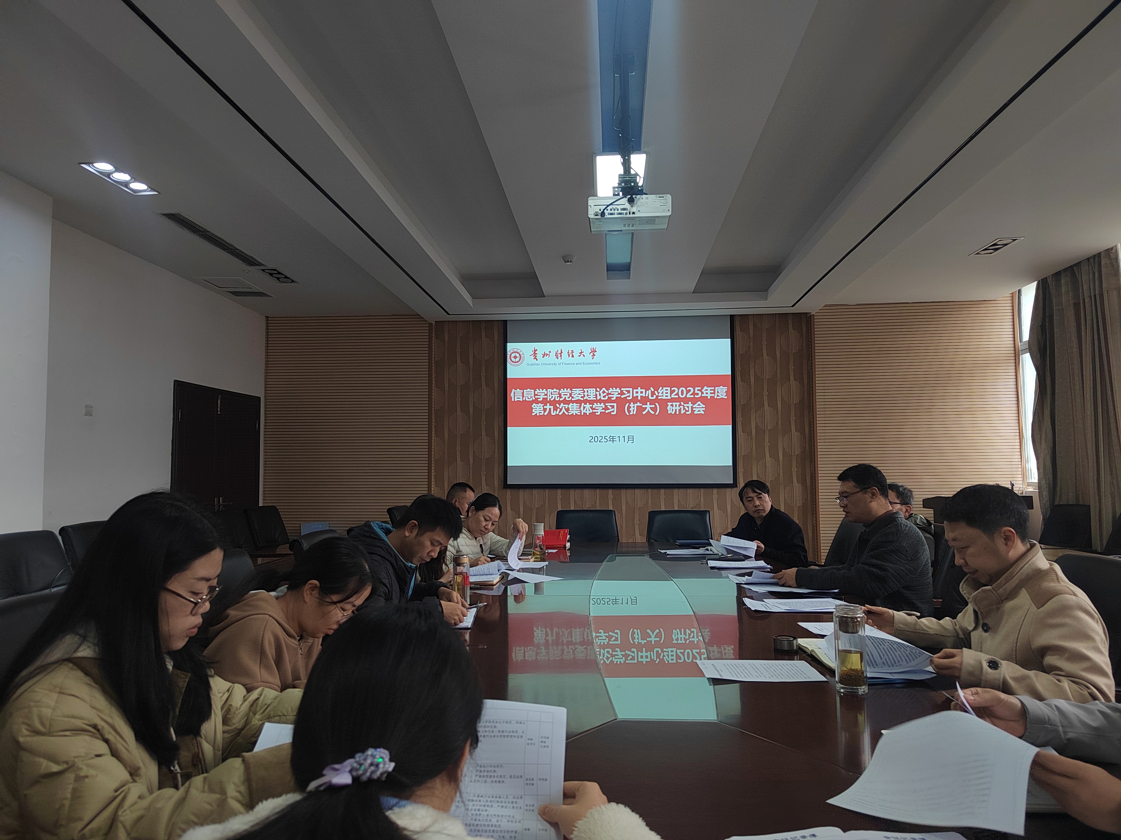 本网讯:(刘小浪 图文报道)10月13日上午,信息学院党委理论学习中心组举行2025年度第九次集体学习(扩大)研讨会在志学楼427会议室召开,专题学习党的二十届四中全会精神。副院长崔鹏,各党支部书记、各系部(科室)负责人列席会议。院党委书记詹伟主持会议并讲话。